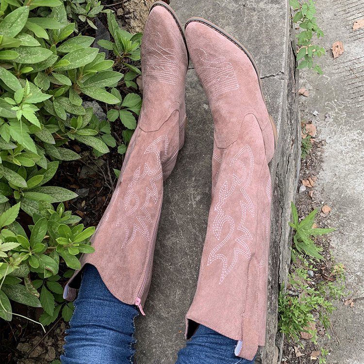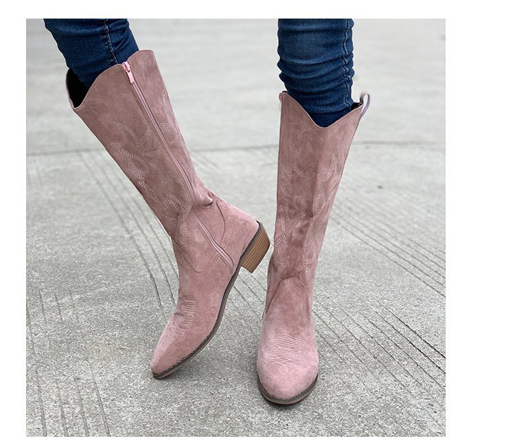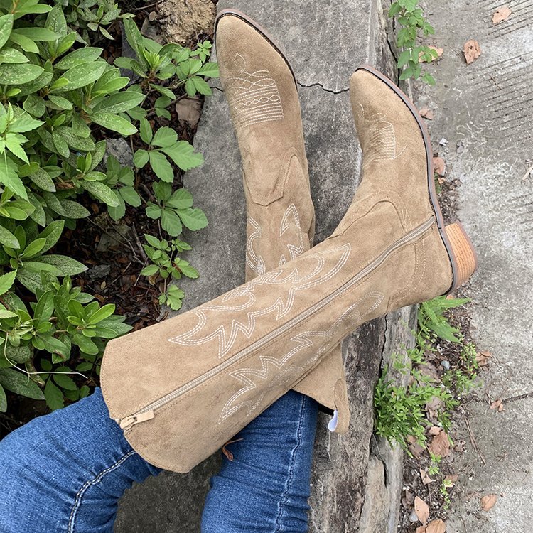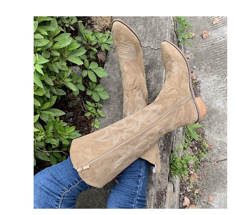 Brown thick heeled mid calf knight boots short boots Western cowboy