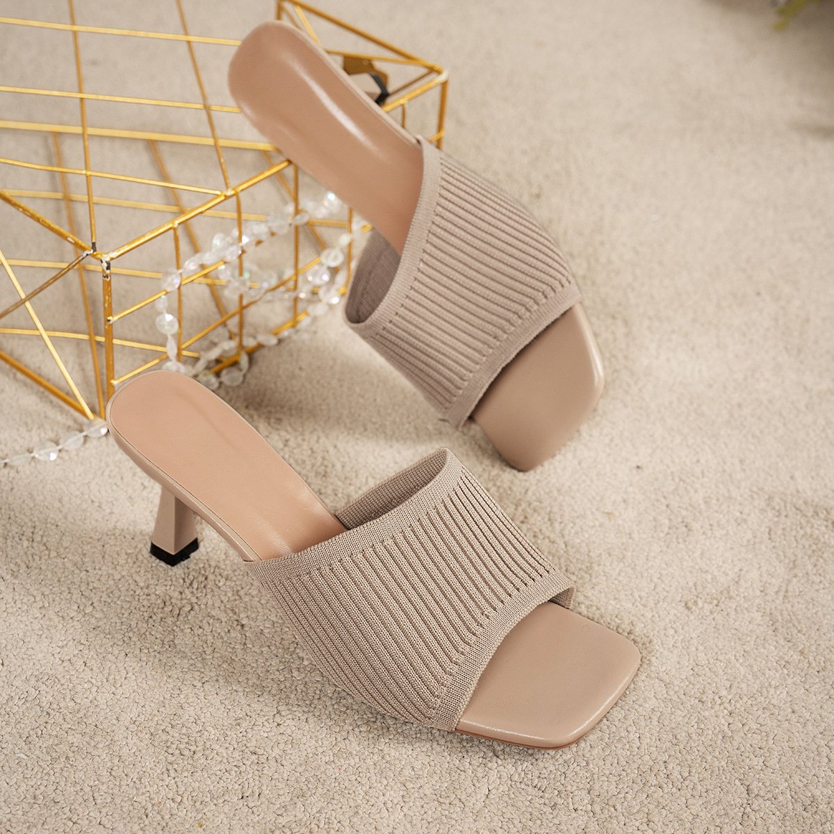 European and American Style Women’s Large Size High Heel Sandals Pure Color Thick Heel Square Toe Knitted Wide Strap One-Word Sandals