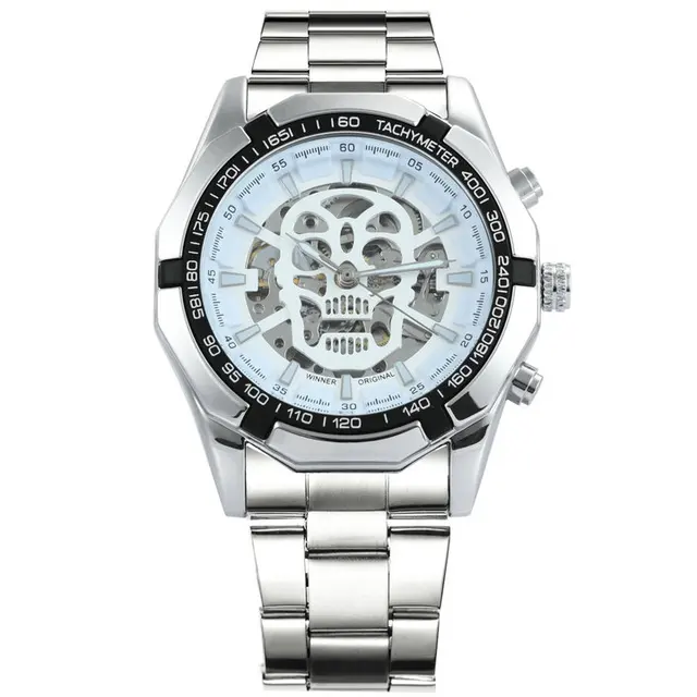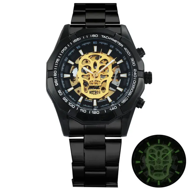 Mechanical Watch Men Skull Golden Stainless Steel Strap Skeleton Man Watch