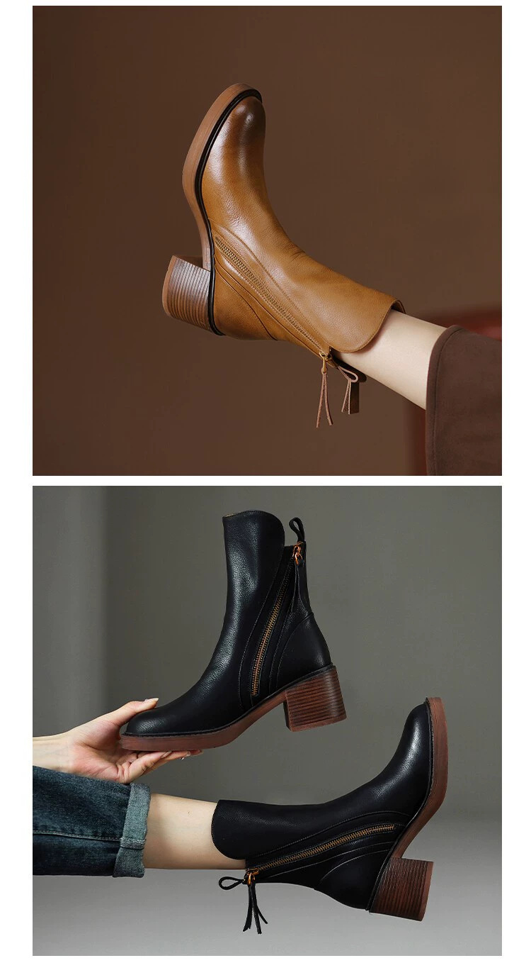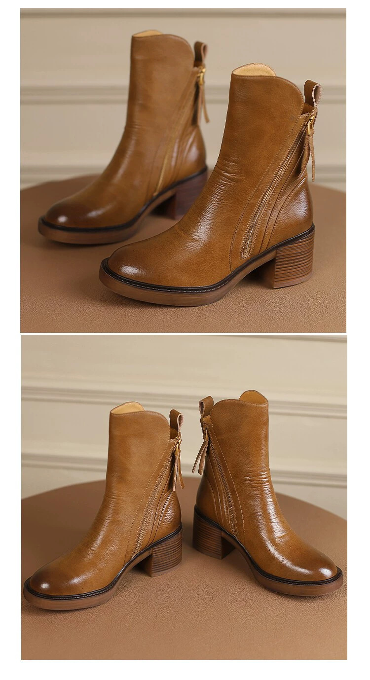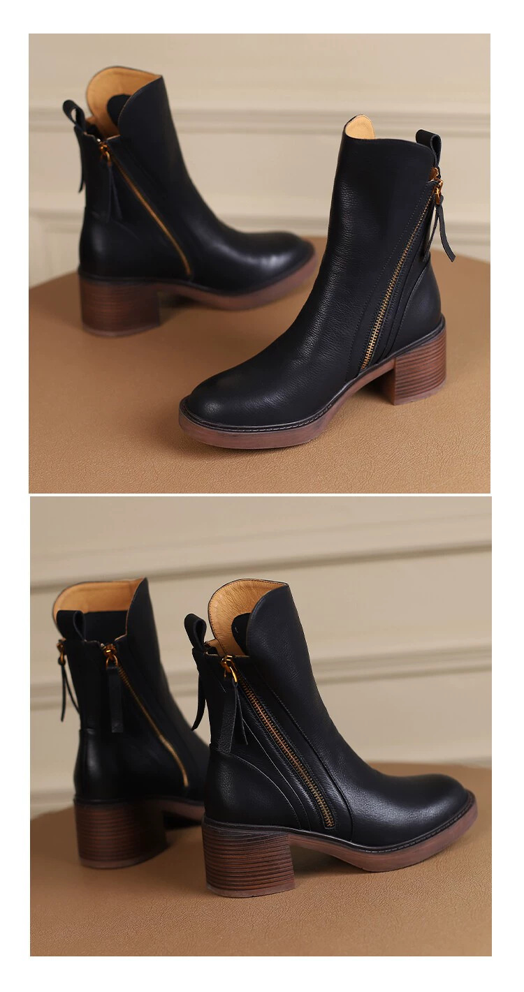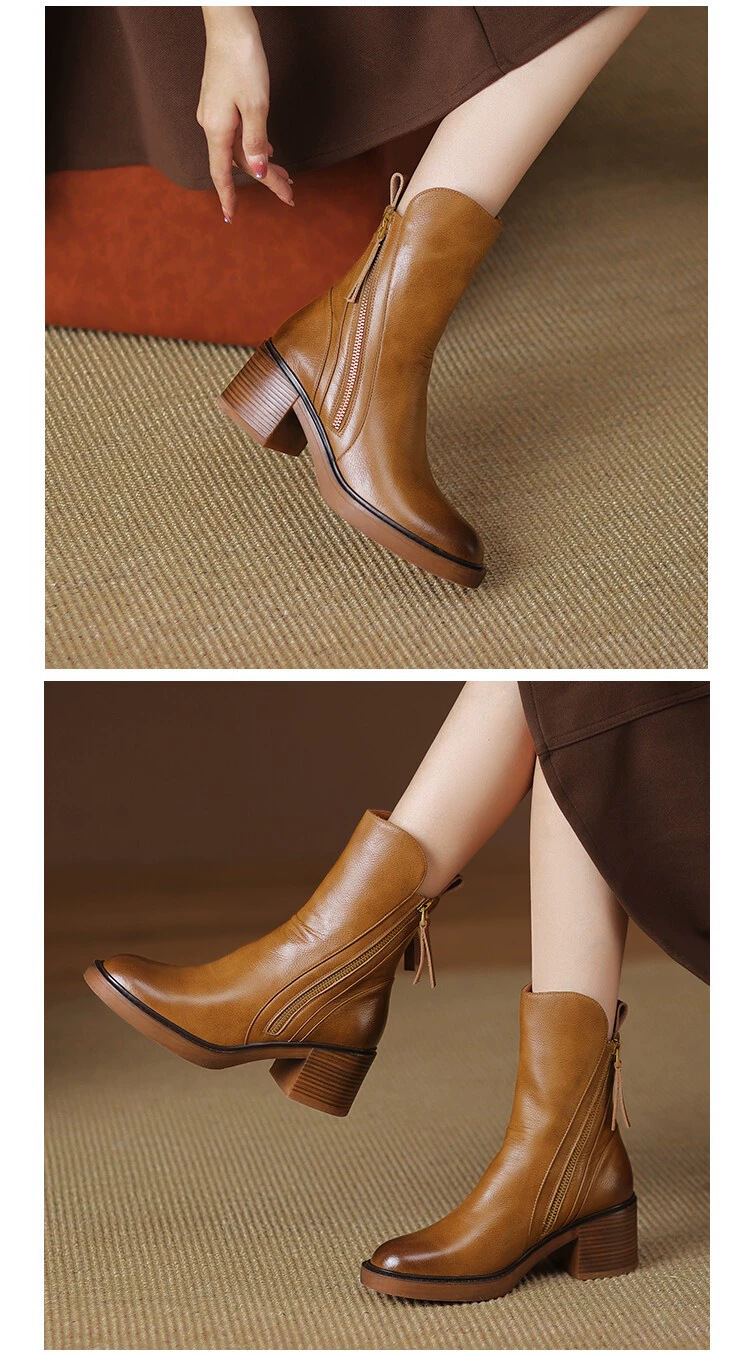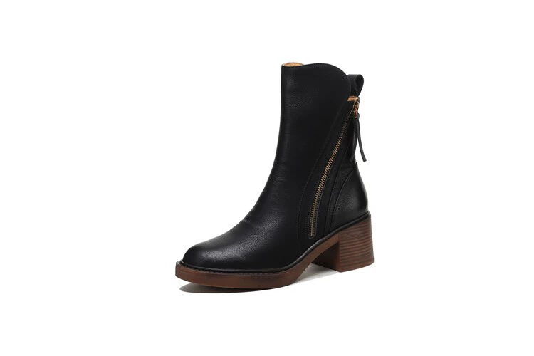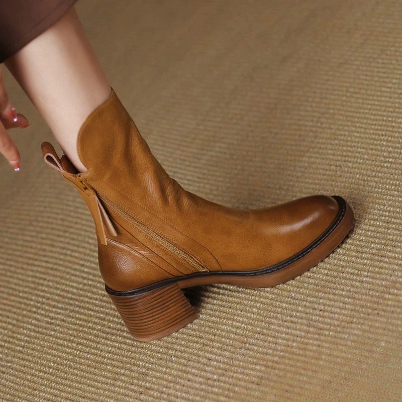 Round headed double zipper thick heel sponge bottom brown retro Martin boots for women
