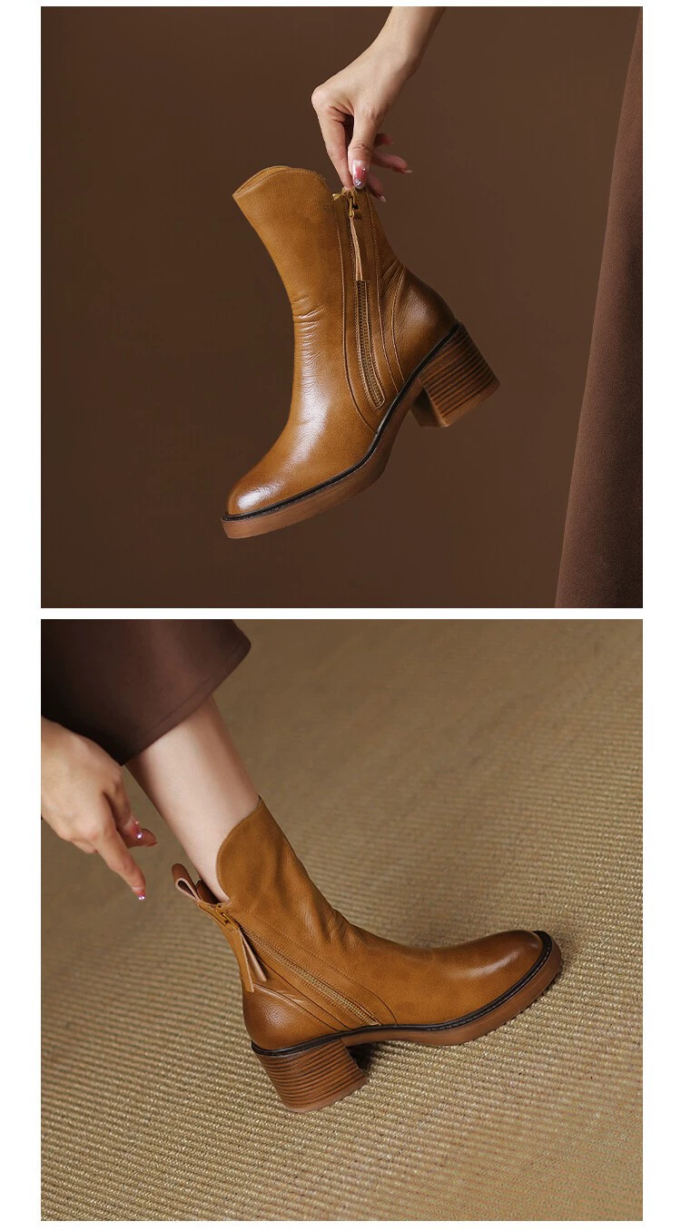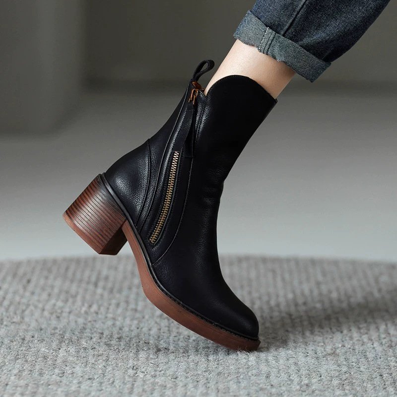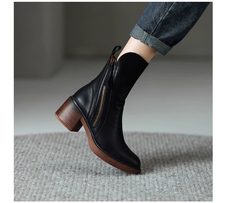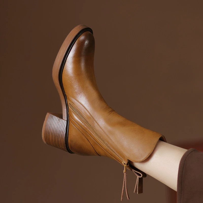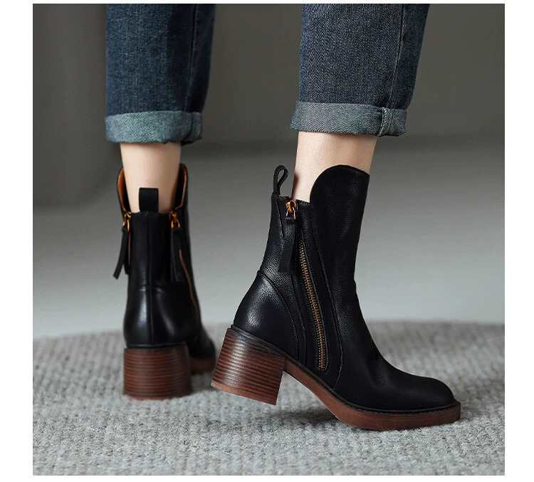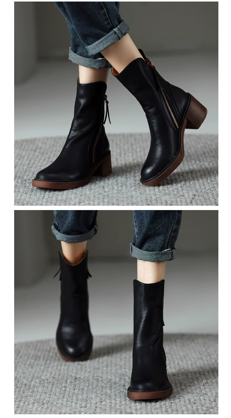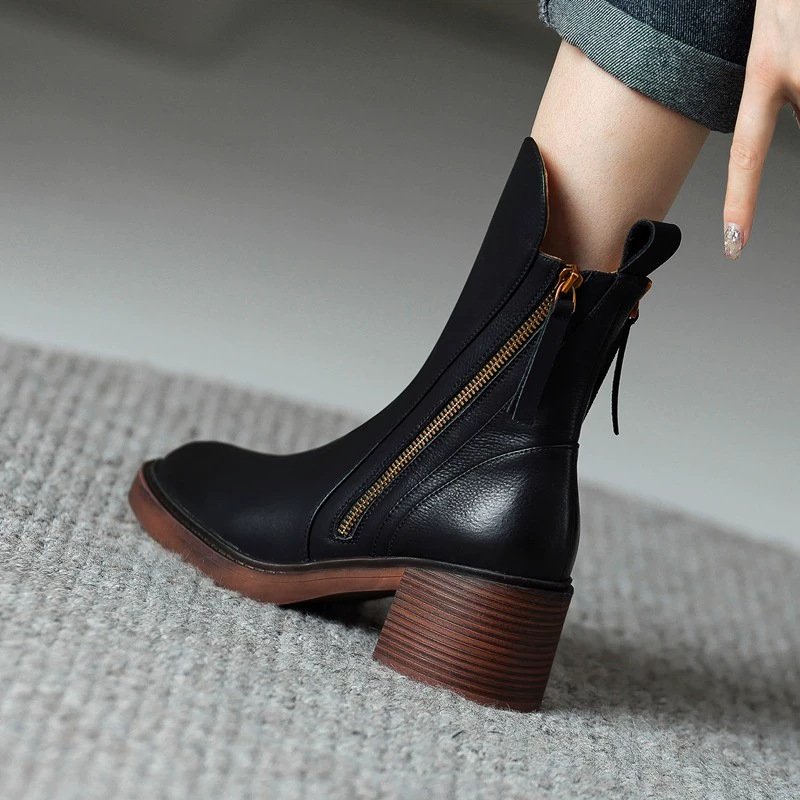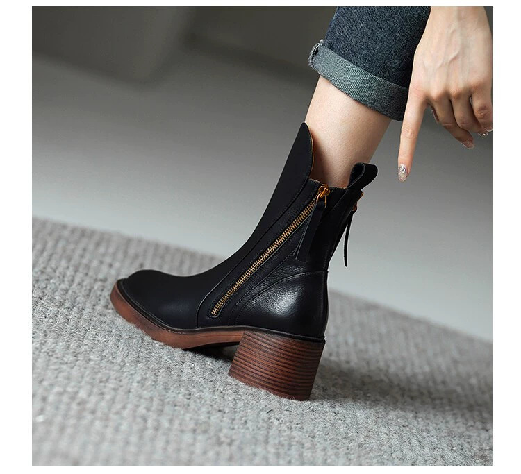 Round headed double zipper thick heel sponge bottom brown retro Martin boots for women
