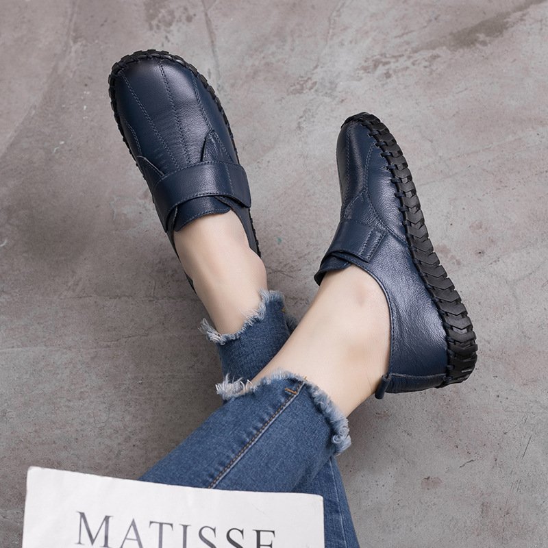 Shenrui Brand Spring and Autumn New Genuine Leather Women’s Shoes with Deep Mouth Velcro Stitching Flat Sole Anti-Slip Middle-aged and Elderly Single Shoes