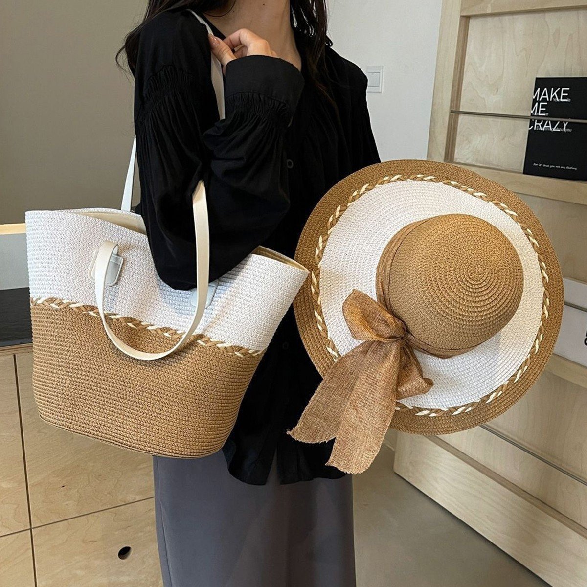 Straw Bag and Hat Set for Women, Beach Vacation, Versatile Sun Protection Wide Brim Hat, Commute Travel Large Capacity Tote Bag